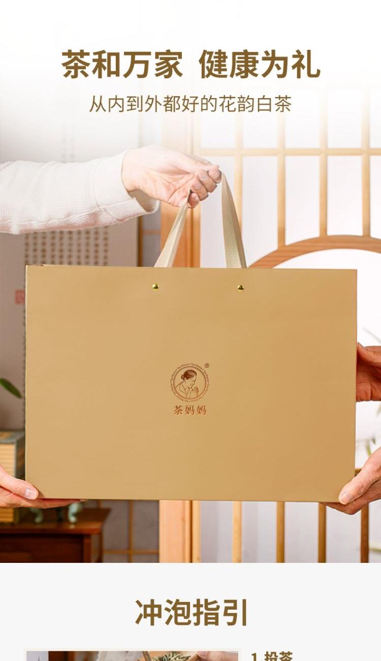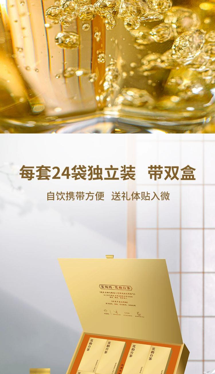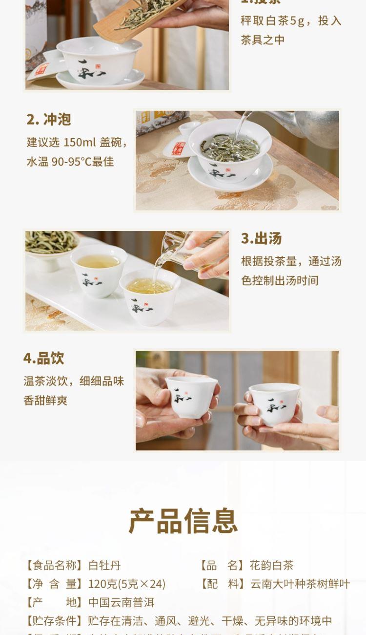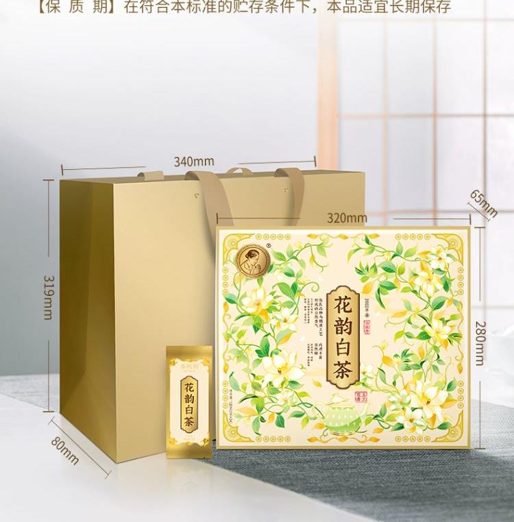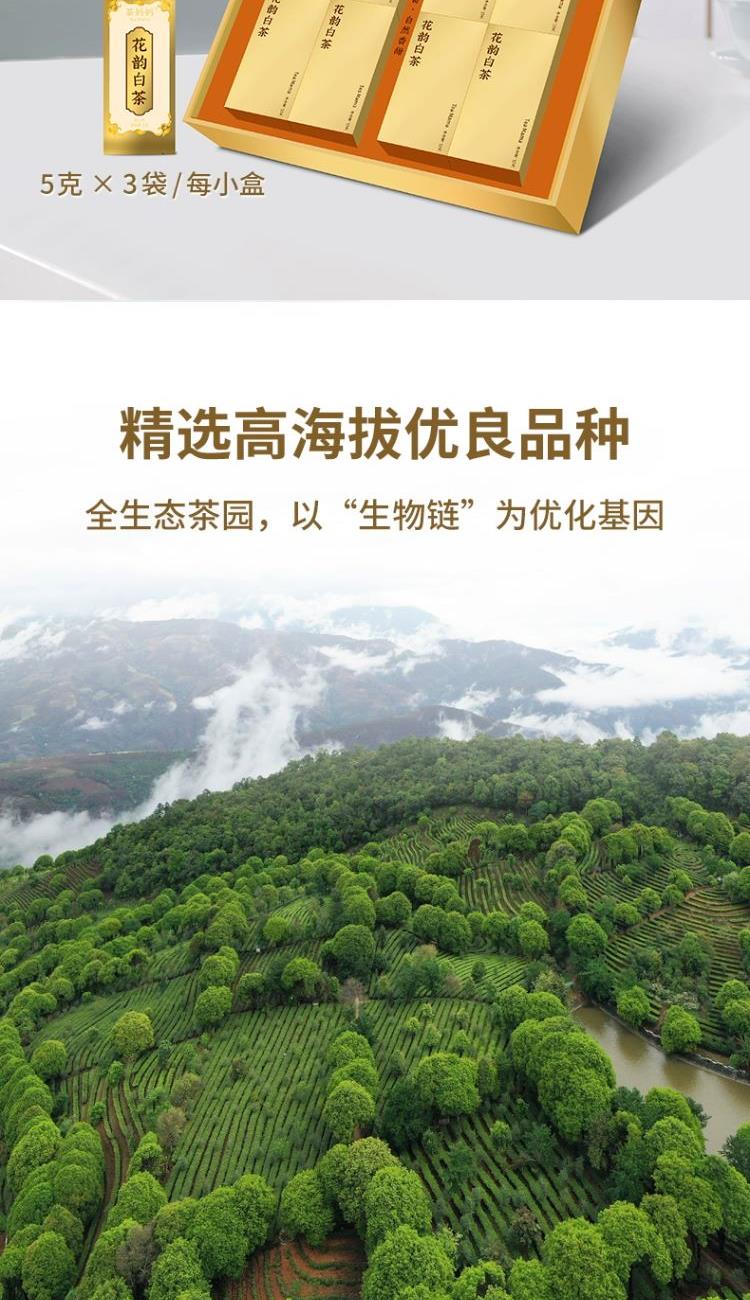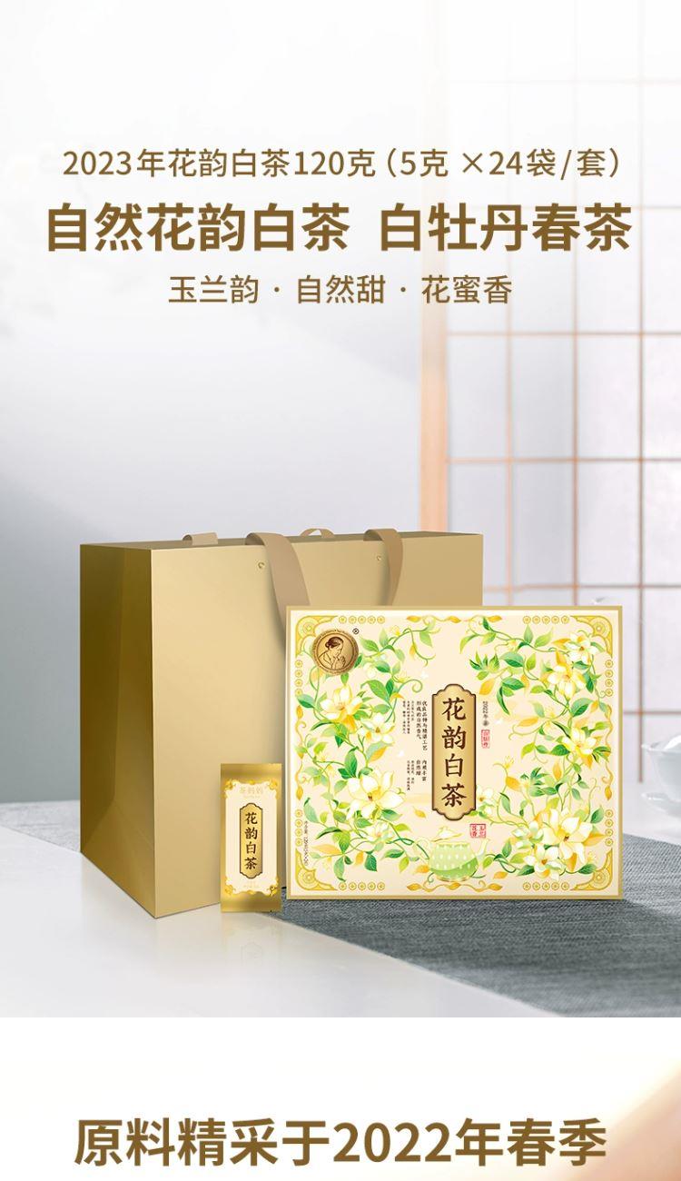 产品:花韵白茶 规格:120克(5克X24袋/套) 配料:云南大叶种茶树鲜叶 产地:中国云南普洱 2022年云南白茶白牡丹 自然花韵白茶 高筛选一芽一叶 等级高 精致彩绘礼盒 24袋独立小包装 精选高海拔优良品种 全生态茶园,以“生物链”为优化基因 茶和万家健康为礼 从内到外都好的花韵白茶